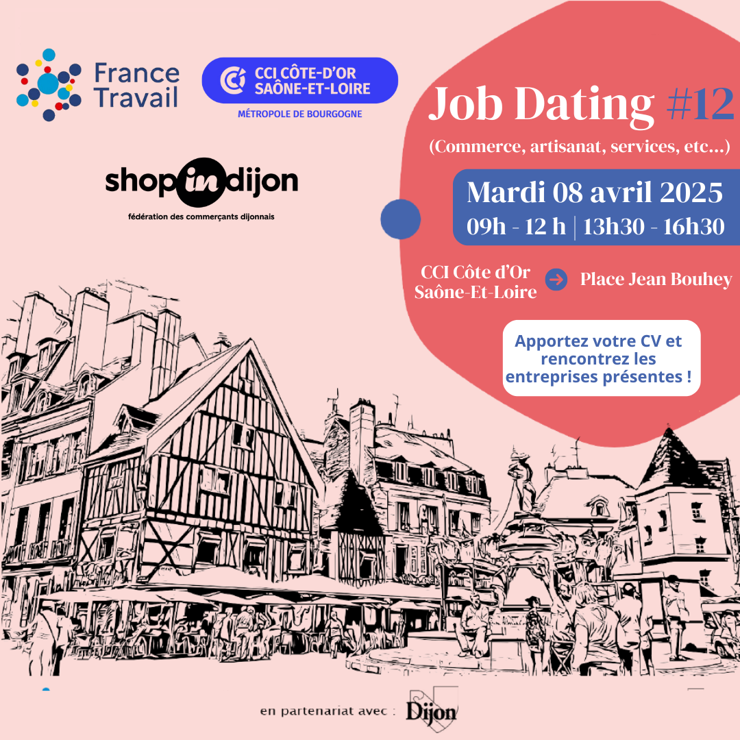 Mardi 08 avril, Shop In Dijon, en partenariat avec France Travail et la CCI Côte-d’Or ⋅ Saône-et-Loire, organise son 12ème Job Dating annuel permettant aux commerçants dijonnais recruteurs et aux candidats de se rencontrer.