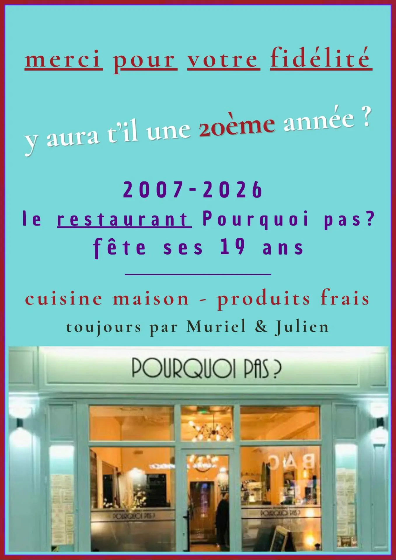 En 2026, le restaurant Pourquoi pas ? célèbre 19 années d’aventure, de cuisine maison et de bons moments partagés.