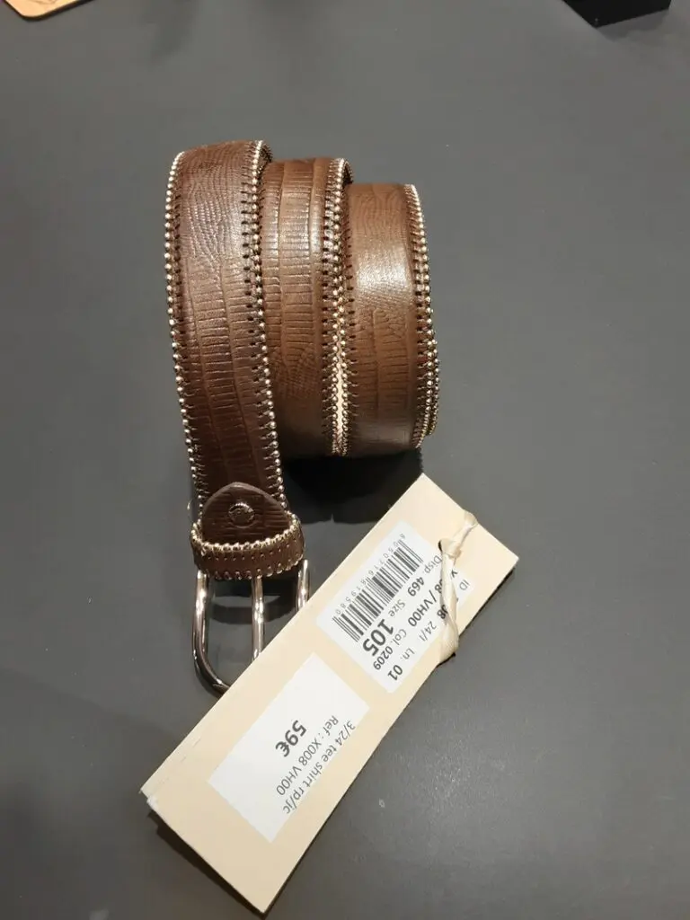 Prêt-à-porterUne très belle ceinture fine ornée de clous dorés, de la collection YES ZEE. Largeur 2.5 cm, beau cuir martelé marron avec 1 passant.