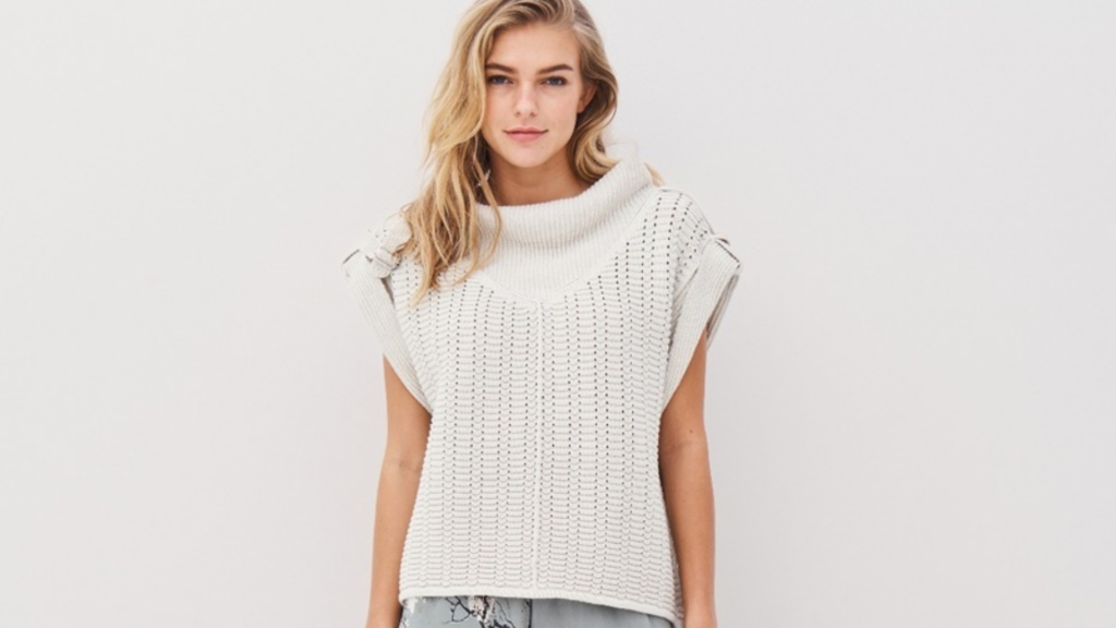 Prêt-à-porterCe pull se distingue par son col montant élégant et ses emmanchures larges, et structurée avec des boucles ajustables en métal situées au niveau des épaules, pour une allure unique et contemporaine.